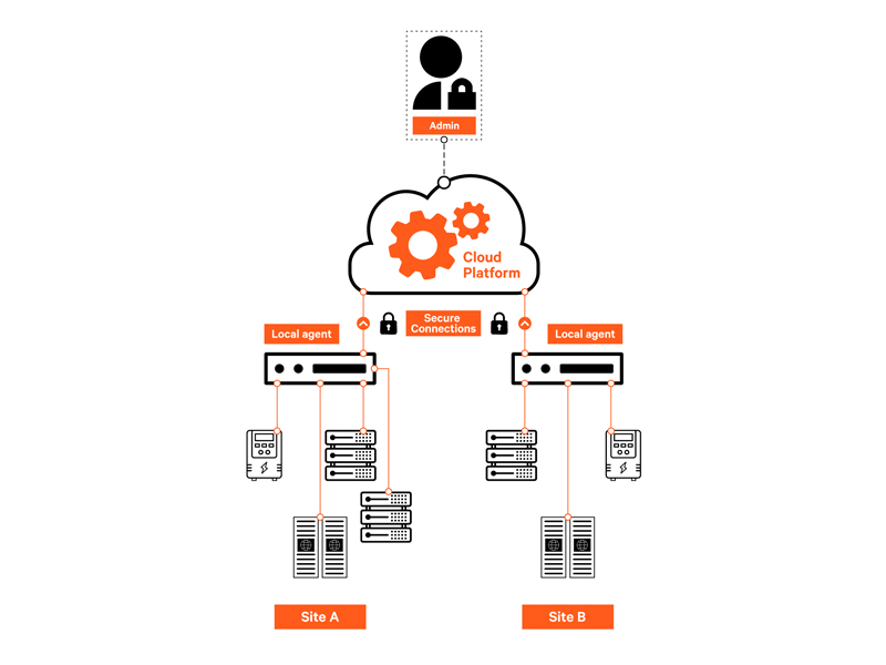 This diagram illustrates Vertiv Environet Connect’s cloud-based architecture, a platform that simplifies managing and monitoring your critical infrastructure. The software platform allows devices to be monitored through a local agent that is installed on the customer's network. Administrators can remotely monitor and manage infrastructure assets, giving you peace of mind, no matter where you are.