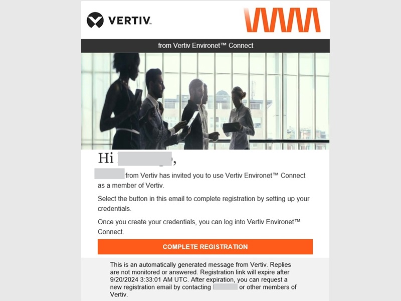 You’ll receive an email from environet-connect@vertiv.com, like the screenshot, with your login details and everything you need to start using Vertiv™ Environet™ Connect.