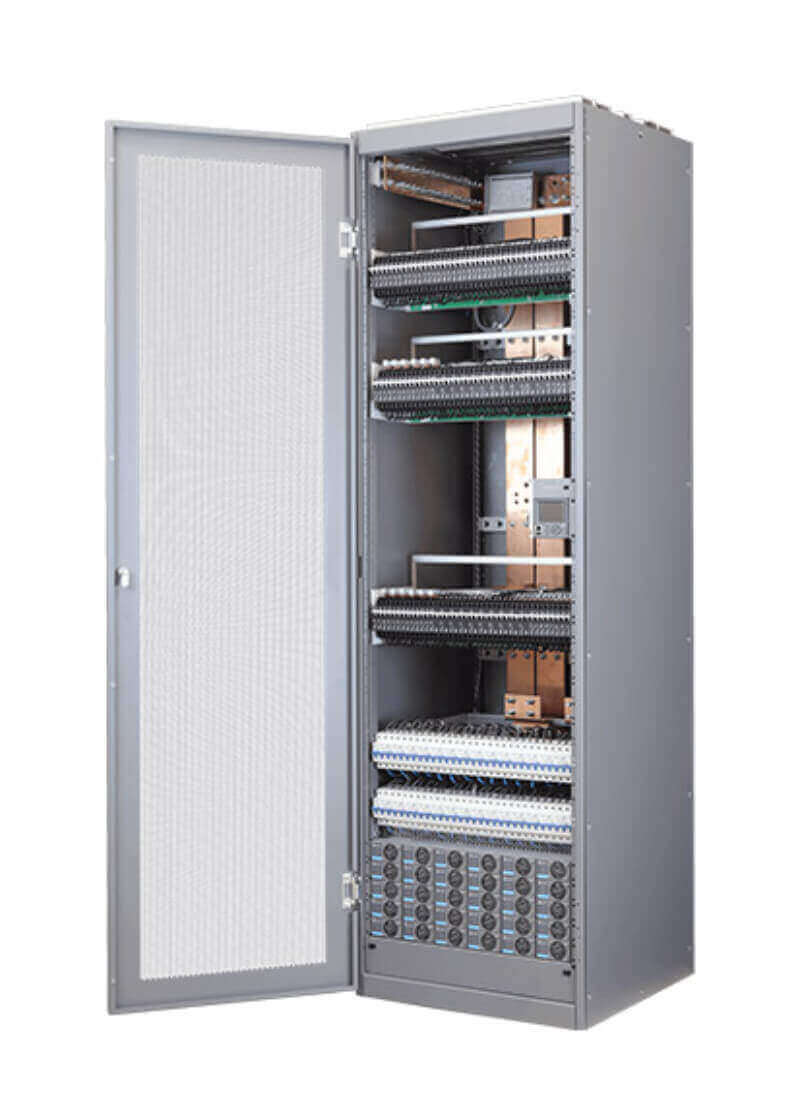 The converter system houses up to 105 kW of 400- to 48-volt efficient converter capacity and lots of distribution points to feed the 48V DC equipment — all in a single cabinet. Since the 400V DC system and batteries can be located far away from the load, this solution helps to free up space for new communication equipment.
